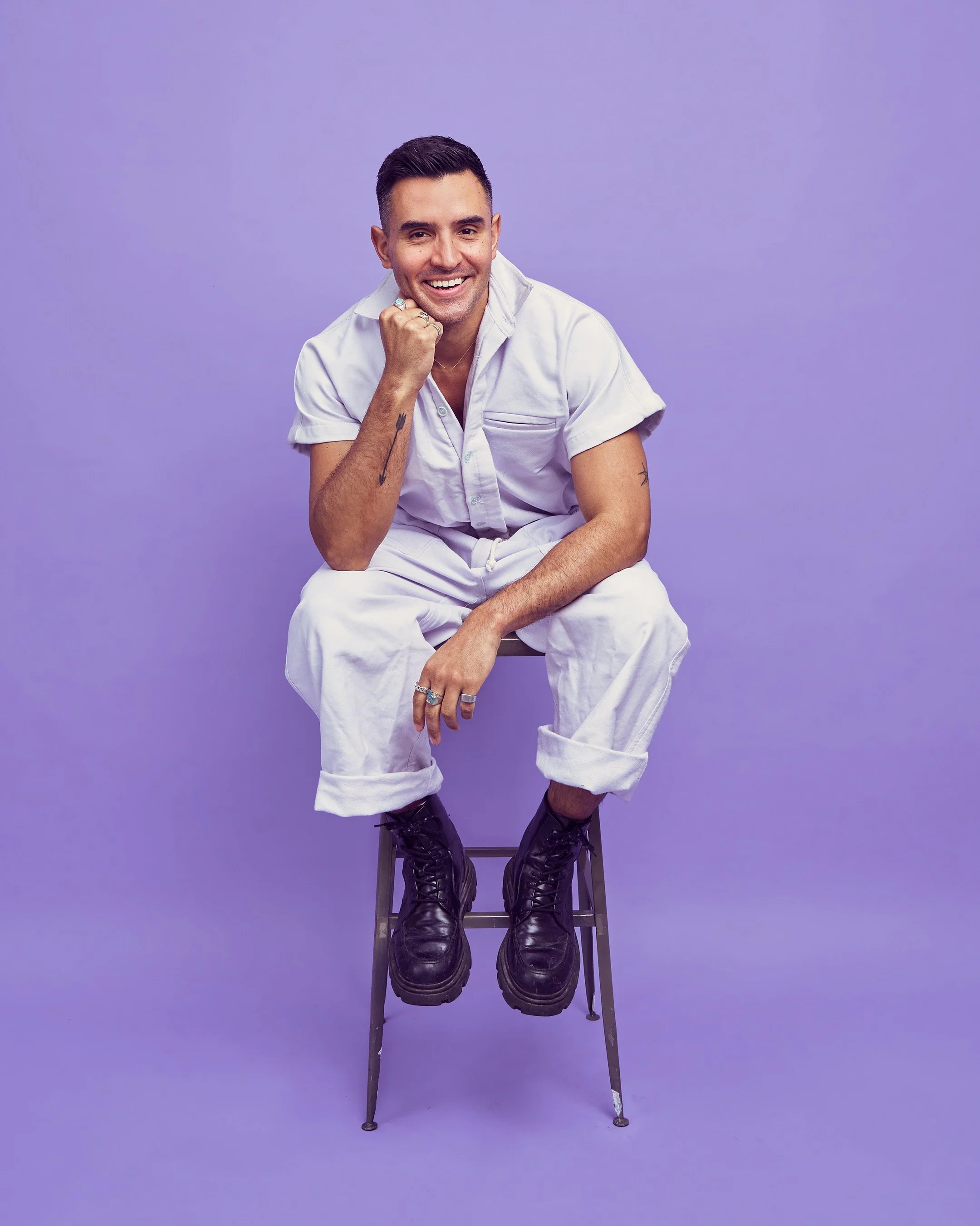 Diego sitting on stool in front of purple backdrop